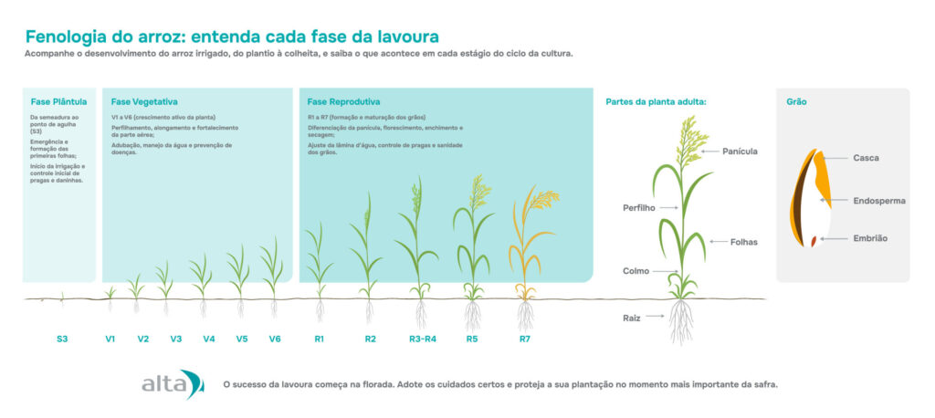 Para entender melhor como o arroz se desenvolve ao longo do ciclo irrigado, veja abaixo o infográfico com as principais fases da fenologia da cultura.