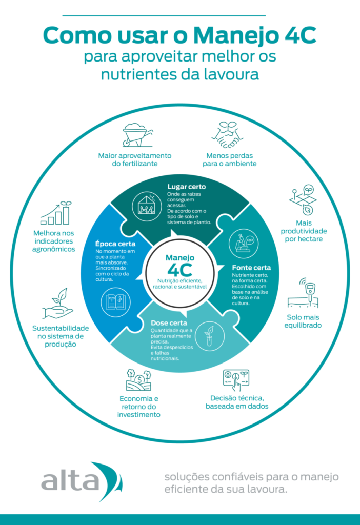 Entre todas as formas de organizar o fornecimento de nutrientes no campo, o manejo 4C se destaca porque transforma um problema recorrente — perdas de fertilizante e baixa resposta da planta — em uma abordagem prática e aplicável