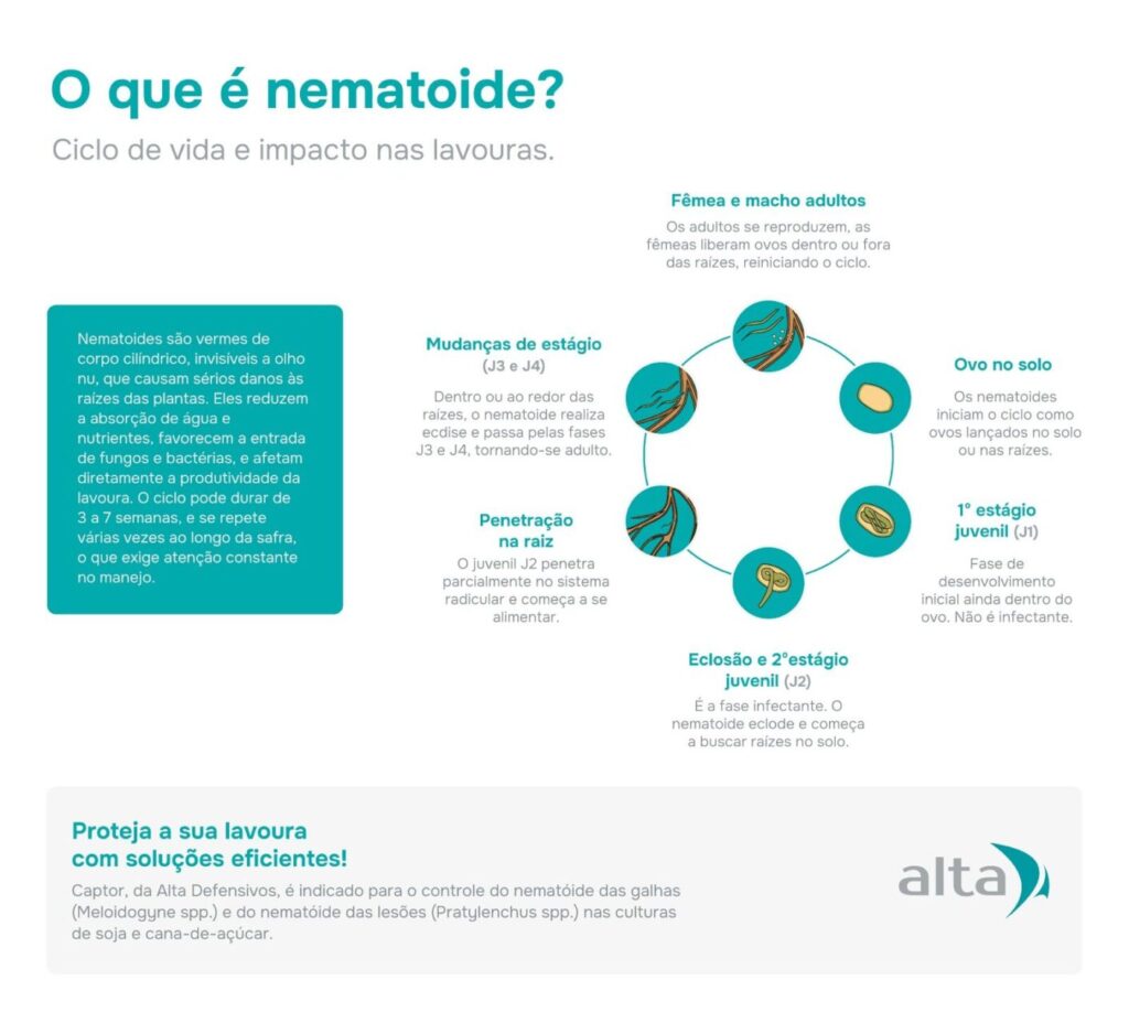 Veja abaixo, no infográfico que preparamos, uma representação visual do ciclo de vida dos nematoides no solo e nas raízes.